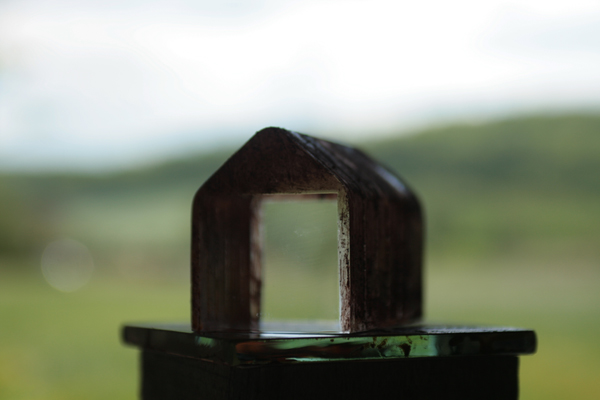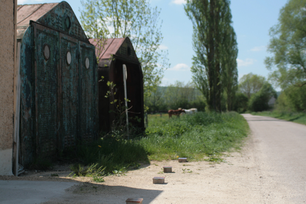 Formant un «chemin de rouille», nombreux pavés de verre émaillés nous mènent jusqu’à un lieu, vieux garage américain rouillé, que l’on est amené à regarder autrement, en découvrant dedans une réplique miniature du lieu.